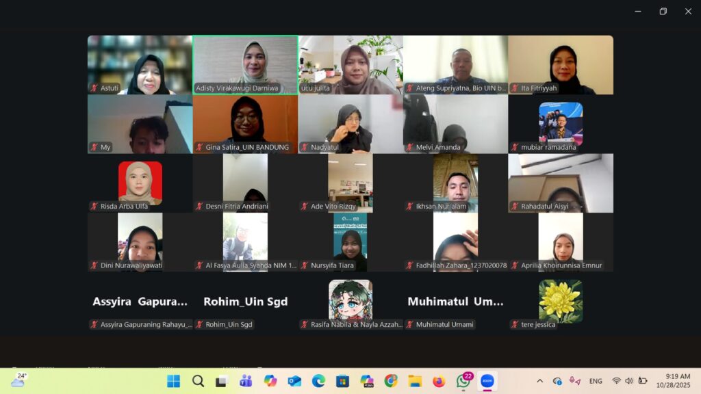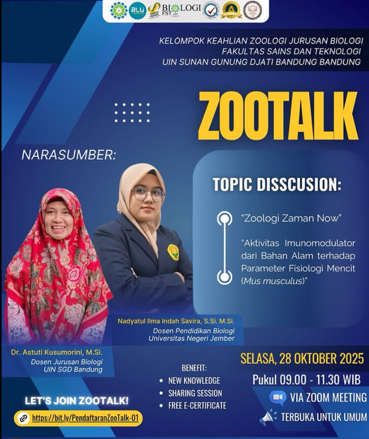Jurusan Biologi Fakultas Sains dan Teknologi UIN Sunan Gunung Djati Bandung kembali menyelenggarakan kegiatan ilmiah BioTalk Kelompok Keahlian (KK) Series pada Selasa, 28 Oktober 2025. Kegiatan ini dilaksanakan secara daring melalui Zoom Meeting dan menjadi wadah penguatan akademik bagi mahasiswa sesuai bidang keahliannya.