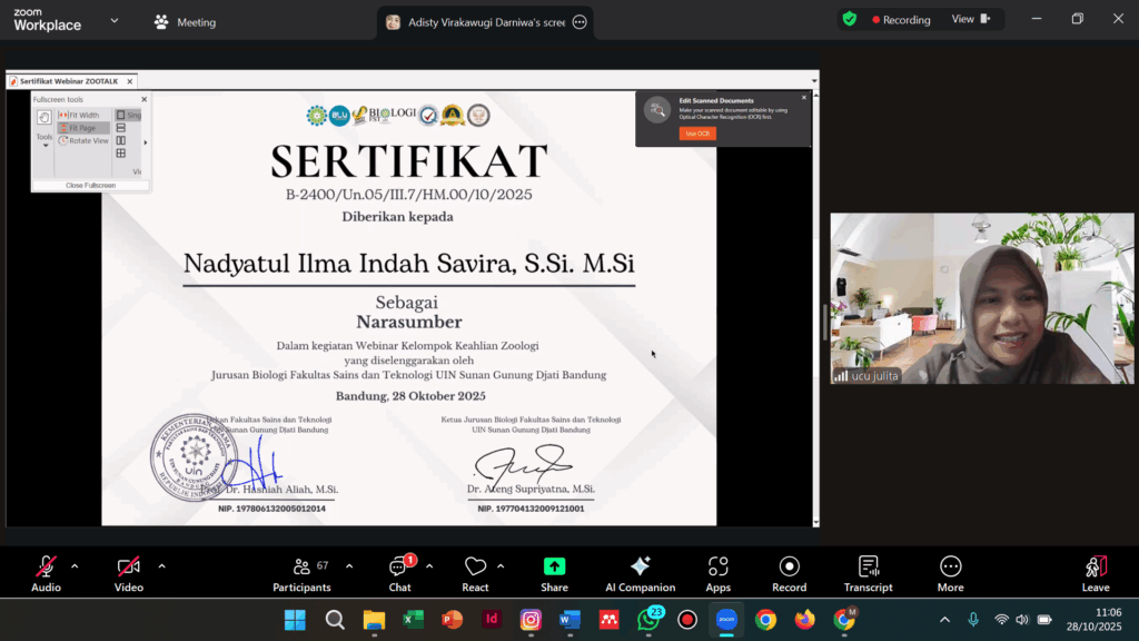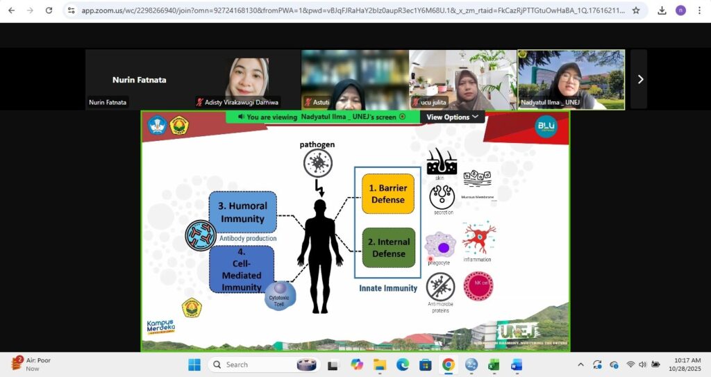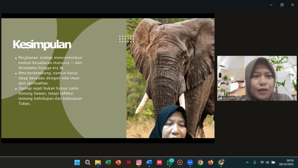 Acara menghadirkan dua narasumber utama, yaitu Dr. Astuti Kusumorini, M.Si. dengan materi “Zoologi Zaman Now”, serta Nadyatul Ilma Indah Savira, M.Si. yang membawakan topik “Aktivitas Imunomodulator dari Bahan Alam terhadap Parameter Fisiologi Mus musculus.”