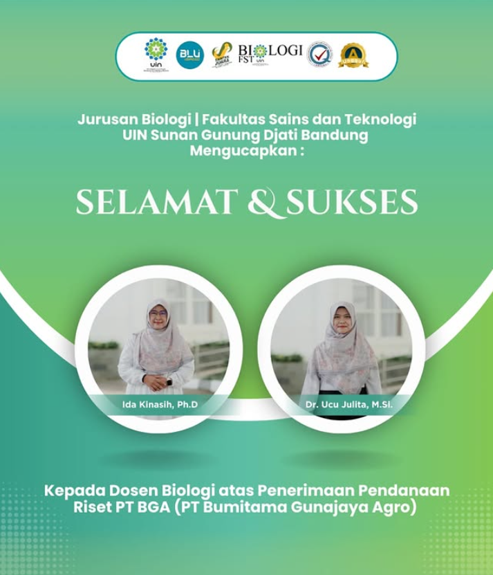 Bandung — Jurusan Biologi, Fakultas Sains dan Teknologi (FST) UIN Sunan Gunung Djati Bandung kembali menorehkan capaian positif dalam bidang penelitian. Dua dosen Jurusan Biologi berhasil memperoleh pendanaan riset dari PT BGA (PT Bumitama Gunajaya Agro) sebagai bentuk dukungan terhadap pengembangan riset di bidang sains dan teknologi.